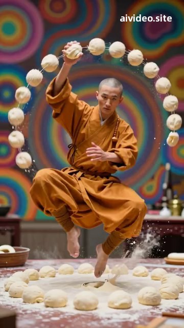 和尚的动作如同被按下了快进键,双手像高速运转的机器从大面团上揪起小面团,和尚身体施展中国武术,拿着揪起的小面团抛向空中,双手交替抛起小面团又接住再抛起的动作,被抛起来的小面团在空中旋转,直至