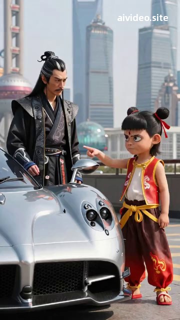 帮我生成一个视频:哪吒在上海陆家嘴的路边指着一辆帕加尼问申公豹:“这是什么?”申公豹回答:“这是二十