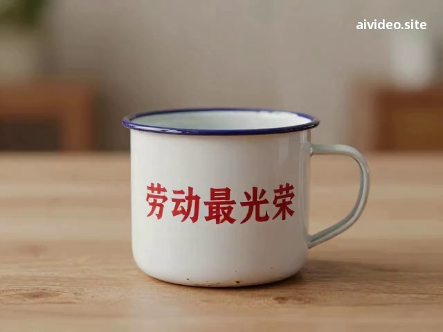 帮我生成一个视频:杯子从中间慢慢搪瓷杯钻出来,掉到桌子上,晃了晃,转正露出劳动最光荣的图案,然后杯子上的图案浮现出来铺满屏幕,其他东西变黑幕