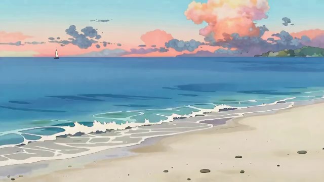 宫崎骏动画风格,唯美治愈,夏日海边,白色沙滩,温柔海浪,透明海水,远处帆船,橘粉色晚霞,海风吹动发丝,干净柔和,慢节奏,舒缓氛围,细腻水彩质感,心旷神怡,治愈心灵,安静美好。