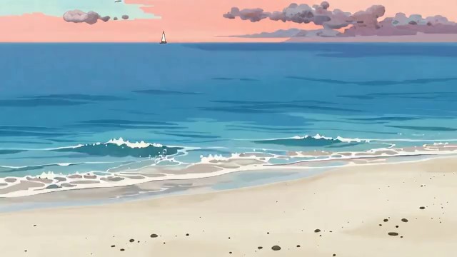 宫崎骏经典动画风格,唯美治愈系夏日海边场景,洁白细腻的沙滩延伸至远方,清澈透明的浅蓝色海水轻轻荡漾,温柔的海浪一层一层缓慢拍打着岸边,泛起细碎洁白的浪花。