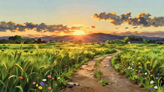 宫崎骏经典治愈动画风格,宁静美好的乡间田园,夕阳西下,暖金色的温柔光线笼罩整片田野,绿色的麦田与油菜花随风轻轻起伏,乡间小路蜿蜒向前,路边开满小野花。一座温馨的小木屋冒着淡淡的炊烟,小溪潺潺流过,蝴蝶与蜜蜂缓慢飞舞,远处有安静吃草的小羊,天空飘着几朵柔软的白云。画面温暖柔和,细腻手绘质感,色调温馨治愈,慢节奏长镜头,整体氛围祥和、宁静、美好,充满生活的温柔与治愈感,让人感到安心与放松,心旷神怡。