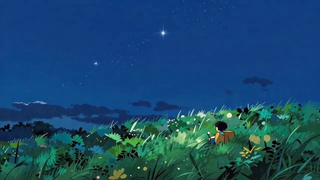 宫崎骏动画风格,静谧治愈,深夜无人的绿色草地,深蓝色夜空布满璀璨繁星,月光温柔洒落,照亮整片大地,草丛间萤火虫点点微光浮动,晚风轻轻吹拂,草丛微微摇晃,世界安静无声,只有自然的温柔低语,画面干净柔和、静谧梦幻,慢节奏舒缓氛围,细腻手绘质感,治愈心灵,心旷神怡,让人卸下所有防备,安心又放松。