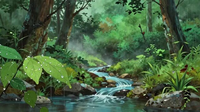 宫崎骏动画风格,清新治愈,雨后幽静的山林,空气清新湿润,树叶上挂着晶莹剔透的水珠,溪流顺着山石叮咚流
