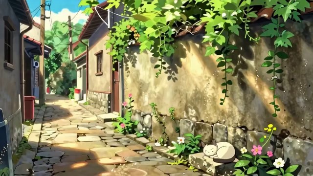 宫崎骏动画风格,温柔治愈,洒满暖阳的老巷青石板路,阳光缓缓流淌,墙面爬满翠绿的藤蔓与小花,慵懒的猫咪蜷缩在墙角打盹,风吹动树叶轻轻摇晃,时光缓慢又温柔,没有匆忙与喧嚣,画面温暖柔和、治愈人心,慢节奏舒缓氛围,细腻水彩质感,安抚人心,心旷神怡,让人感受岁月静好的温柔。