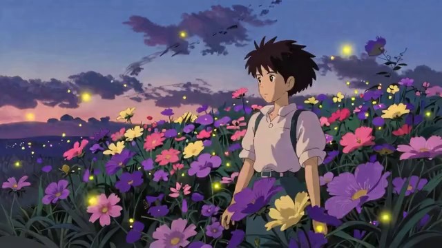 宫崎骏动画风格,梦幻治愈,傍晚的彩色花田,紫色、粉色、淡黄色花朵随风轻轻起伏,晚风温柔轻柔,蓝紫色渐变晚霞铺满整片天空,萤火虫悄悄亮起微光,在花丛间缓缓飞舞,世界浪漫又安静,满是温柔的童话氛围,画面柔和梦幻、唯美动人,慢节奏舒缓长镜头,细腻光影,水彩手绘质感,治愈心灵,心旷神怡,温柔又美好。