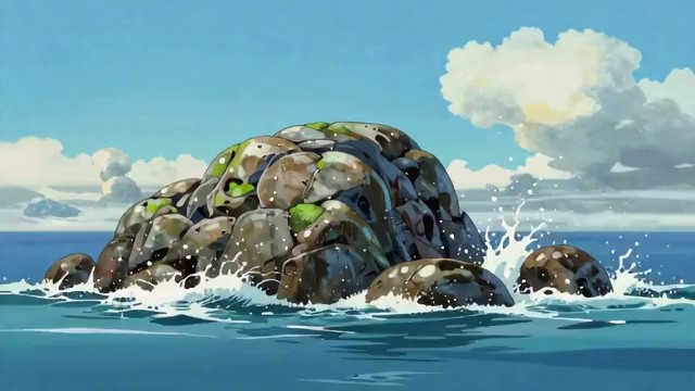 宫崎骏动画风格,清新治愈,海边矗立的光滑礁石,清澈海浪轻轻拍打礁石,溅起晶莹透亮的水花,