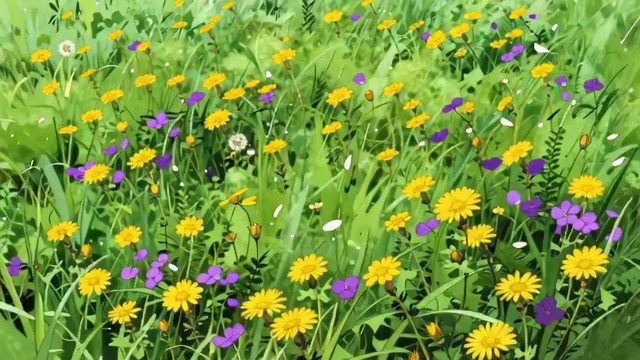 宫崎骏动画风格,清新治愈,春日开满野花的田野,遍地小黄花、蒲公英与紫色小花,微风轻吹,花瓣轻轻飞舞,