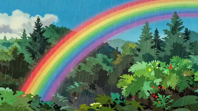 宫崎骏动画风格,梦幻治愈,雨后彩虹横跨的森林,彩虹色彩绚烂柔和,光线明亮温暖,树叶上水珠晶莹透亮,空气清新湿润,草木绿意鲜亮,蝴蝶在彩虹下飞舞,画面梦幻美好、治愈人心,慢节奏舒缓氛围,细腻水彩质感,治愈心灵,心旷神怡,满是雨后的温柔与希望。