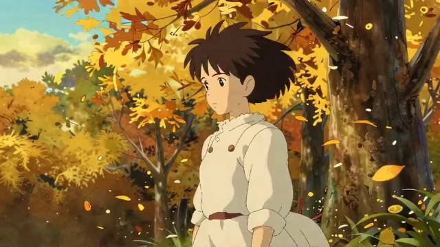 宫崎骏动画风格,伤感温柔,秋日黄昏的林间,金黄落叶纷飞,天空昏黄温柔,风声轻轻响起,带着淡淡的离别与思念情绪,光影渐渐柔和,画面安静柔和、温柔伤感,慢节奏细腻光影,细腻水彩质感,治愈内心,心旷神怡,温柔抚平所有难过。