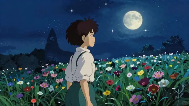 宫崎骏动画风格,梦幻治愈,深夜的星光花田,星星在夜空闪烁,月光温柔洒落,